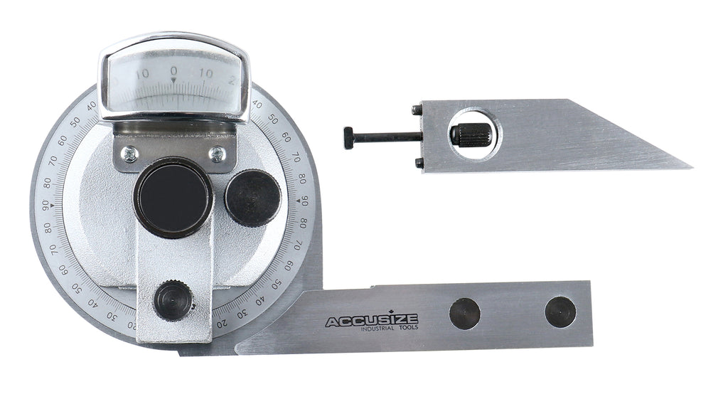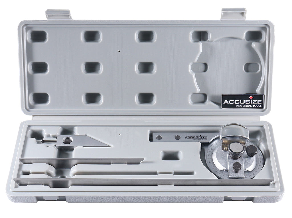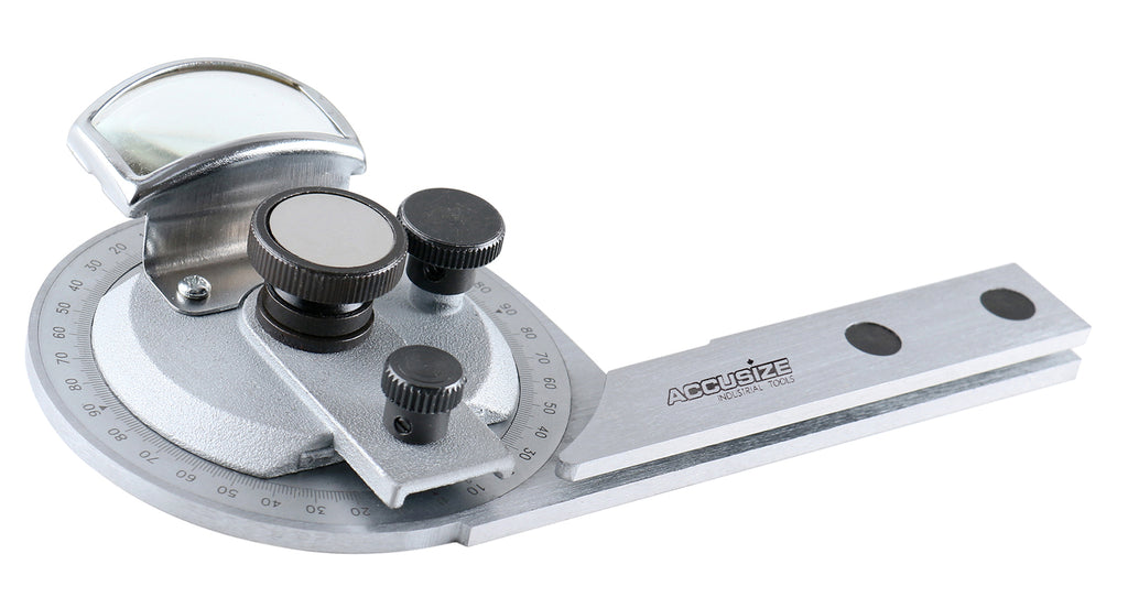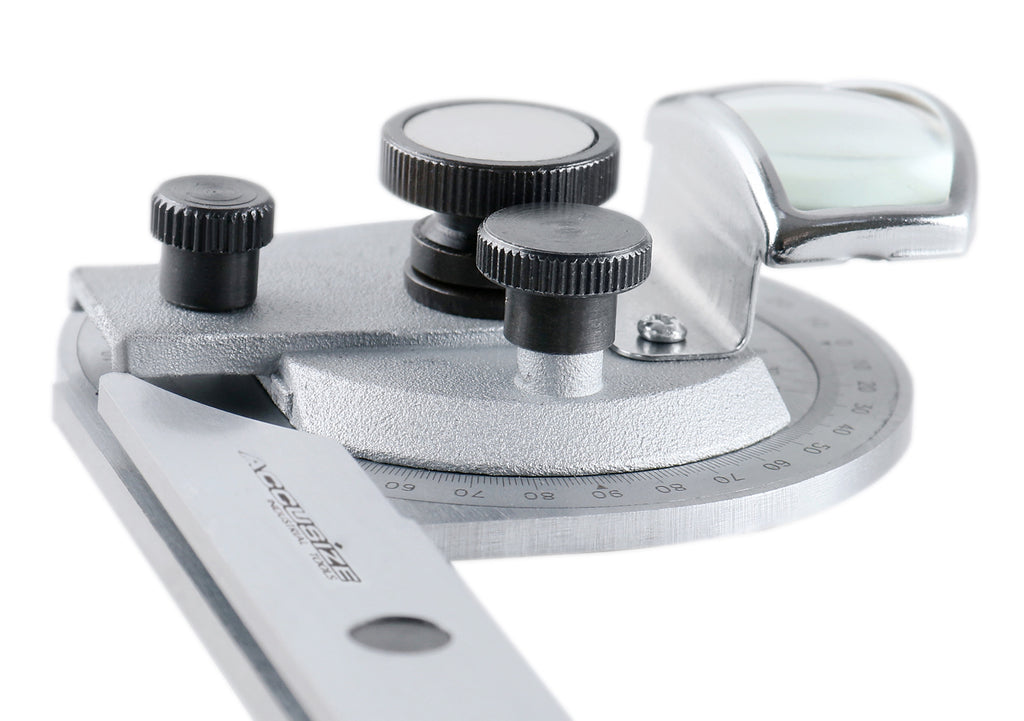 • Bevel protractor includes magnifier for vernier