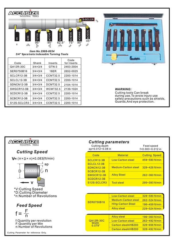3/4" 9 pièces/jeu, outils de tournage en carbure indexables et barre d'alésage, 2988-0034