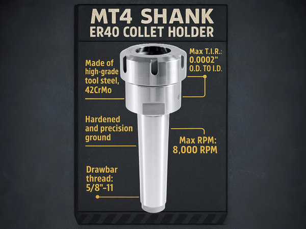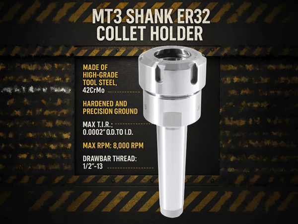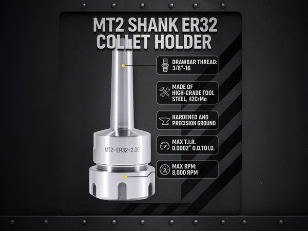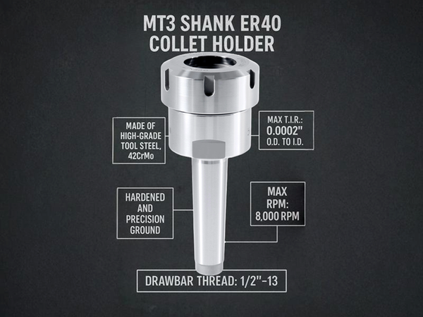 Lesmandrins à pince ER à tige conique R8 sont généralement utilisés sur les fraiseuses manuelles. L'extrémité conique R8 s'intègre dans une broche de machine et l'écrou de serrage ER est compatible avec la pince ER. L'écrou ER32 est compatible avec les pinces de style ER32 et l'écrou ER40 fonctionne avec une pince de type ER40. Les pinces ER sont utilisées pour contenir toutes les machines-outils avec une tige ronde. Ces mandrins à serrage ER à tige R8 offrent une qualité nettement supérieure à la moyenne sur le marché. Le taux d'écoulement de l'indicateur t otal (TIR) est inférieur à 0,0002". Le MAX RPM sur les fraiseuses manuelles est de 8 000. Le fabricant des mandrins de serrage les inspecte et les produit dans un laboratoire et une usine hautement sophistiqués. On peut difficilement s'attendre à ce que les mandrins de l'autre MFG soient de la même qualité.