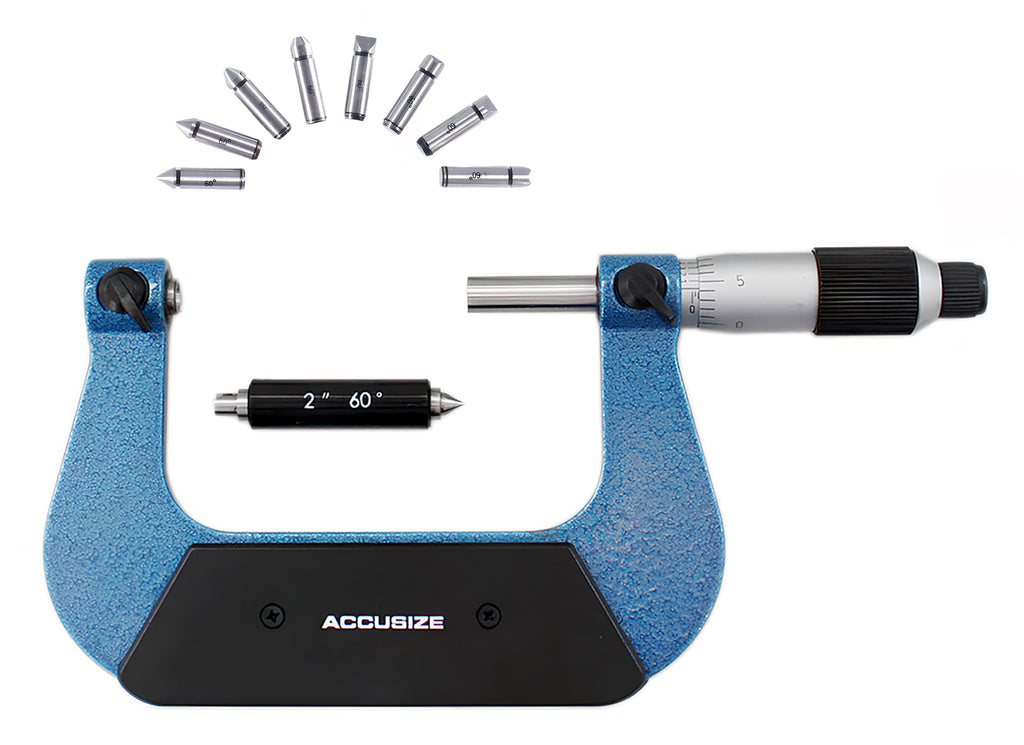 Un micromètre fileté à vis est généralement utilisé pour mesurer directement le pas du filetage. Le micromètre à filetage à vis a une broche pointue de 60 degrés et une enclume pivotante en forme de V double.