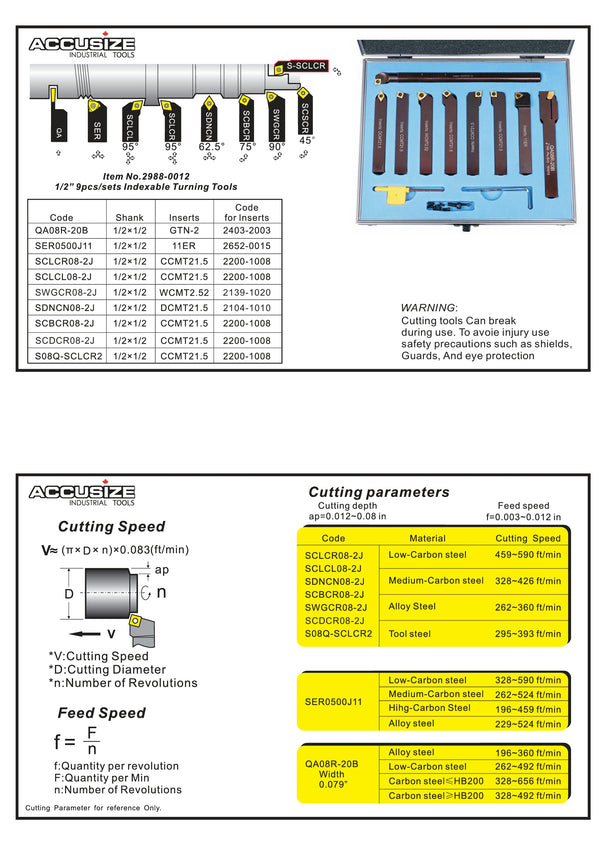 1/2" 9 pièces/jeu, outils de tournage en carbure indexables et barre d'alésage, 2988-0012