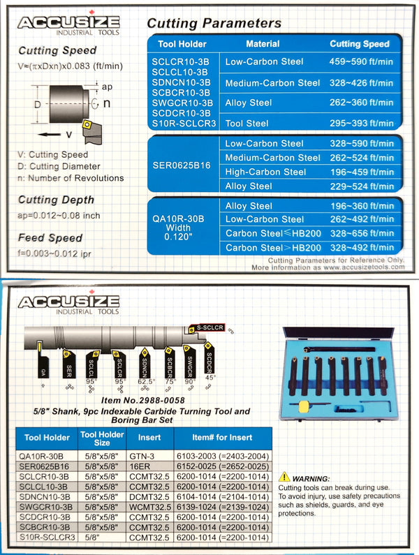5/8" 9 pièces/jeu, outils de tournage en carbure indexables et barre d'alésage, 2988-0058