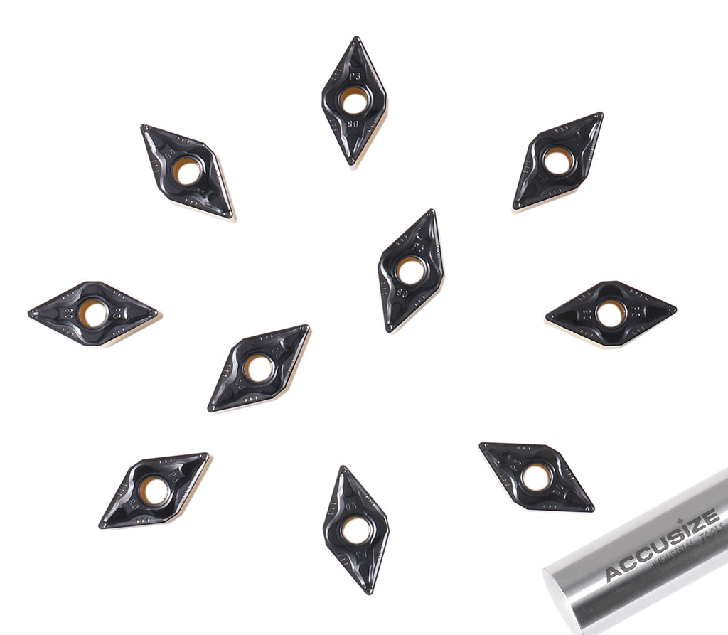 Accusize DNMG sont des inserts en carbure rhombique double face 55° pour l'usinage d'une large gamme de matériaux métalliques dans des conditions de coupe moyennes. Lorsqu'un arête de coupe de l'insert DNMG devient terne, il suffit de faire pivoter l'insert dans le support pour utiliser l'arête tranchante. Le revêtement CVD des plaquettes offre une durée de vie beaucoup plus longue que les plaquettes non revêtues.